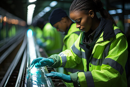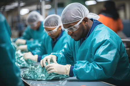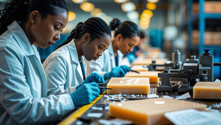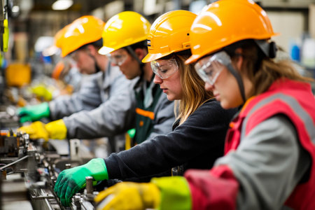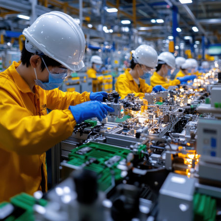 In a vibrant manufacturing facility, skilled individuals dressed in safety gear focus intently on their tasks.