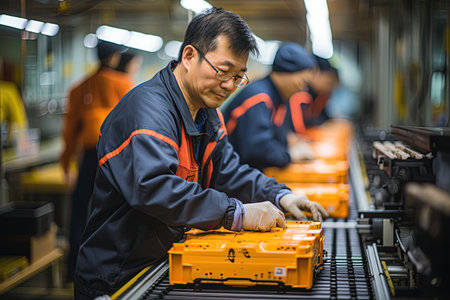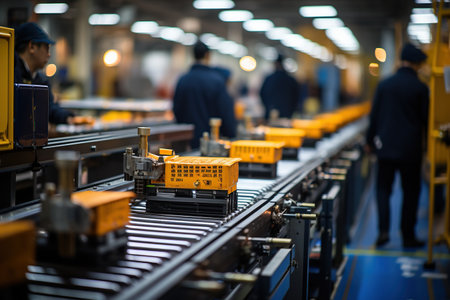 Dedicated workers skillfully operating heavy machinery in a dynamic and bustling factory environment