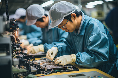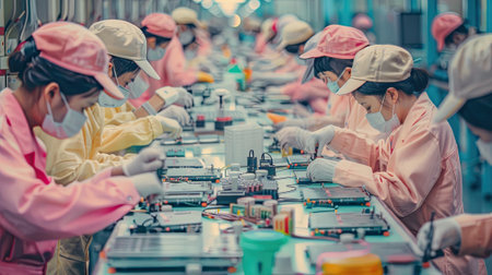 Photo of a diverse group of electronics assembly workers in pastel uniforms, soldering circuit boards, with ample room for text, captured with a 50mm lens at f/2.0, --ar 16:9 Job ID: 6fcdd3e5-6b7f-4177-86a6-8ddbbf5312b9