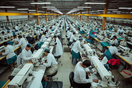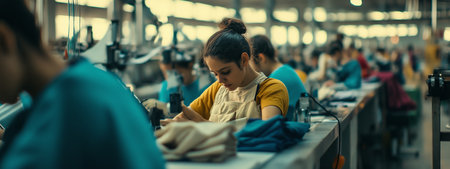 Women working diligently in a large textile factory during the day, focused on assembling garments and fabric products