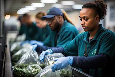Agile workers separate recyclable waste with determination in screening installation., generative AI