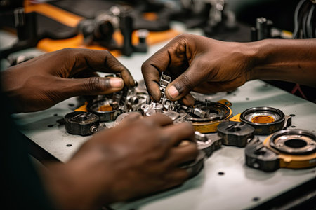 two hands working on watch parts in an industrial workshop, close - up shot with focus to the metal part