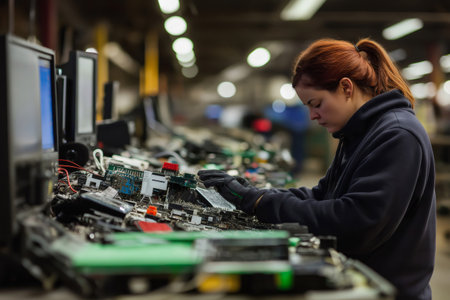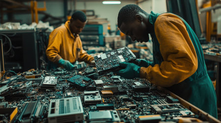 This image captures workers in a recycling facility disassembling electronic waste, emphasizing sustainable practices and teamwork in resource recovery efforts.