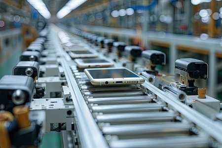 An automated line for the production of modern smartphones. Modern technologies for assembling mobile devices.