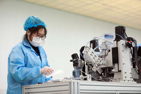 LUANNAN COUNTY, Hebei Province, China-April 23, 2020: Workers are busy on the production line in a Medical mask factory.