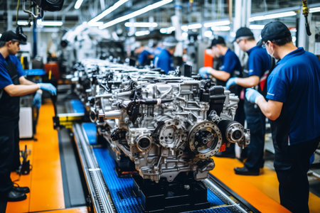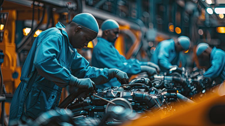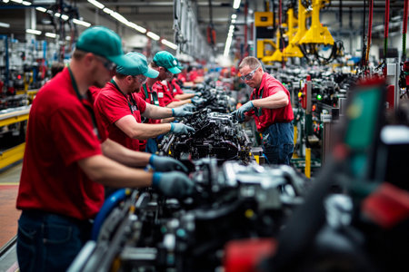 In a vibrant factory, skilled workers in red shirts expertly assemble engines, focused on their tasks with precision. The atmosphere buzzes with energy and teamwork, showcasing craftsmanship.