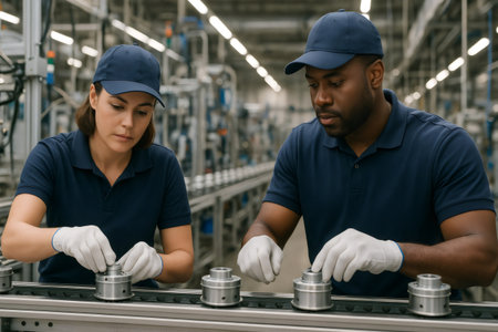 Two factory workers wearing gloves and caps are focused on assembling metal parts on a production line in a modern industrial facility