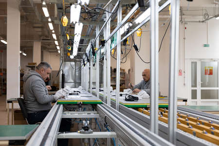 Minsk, Belarus - Dec 15, 2021: Photo of a large plant inside for assembling monoblocks for computers. Male workers on a conveyor belt. Engineers work on a modern high-tech factory