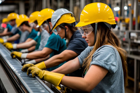 In a bustling manufacturing facility, workers focus intently on assembling products, all wearing safety helmets and gloves. Their synchronized efforts reflect teamwork and dedication.
