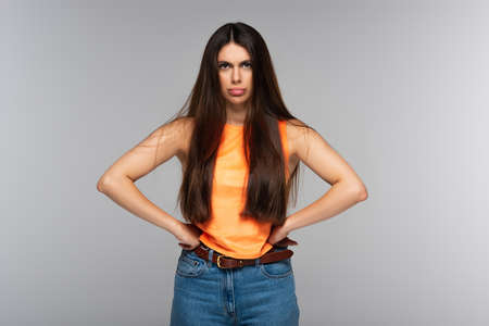 displeased woman with long hair standing with hands on hips isolated on gray
