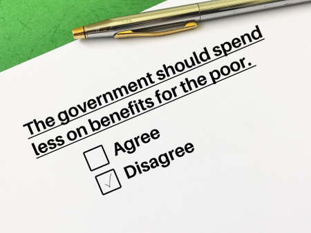 One person is answering question about social inequality. The person does not agree that the government should spend less on benefits for the poor.