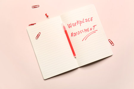 Notebook with text WORKPLACE HARASSMENT and stationery on color background