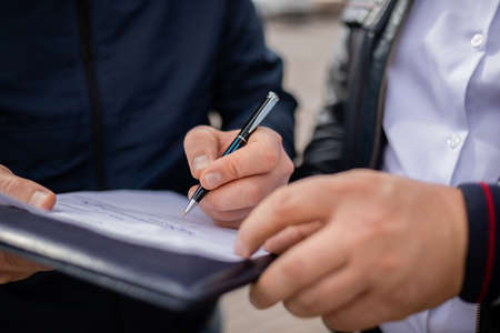 Contract signing close up shot. Customer sign papers in dealership office, client buying car or purchasing property