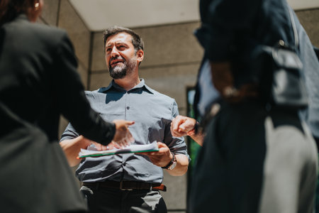 A man with documents in their hands in their black shirts on the street with a pen in his hand