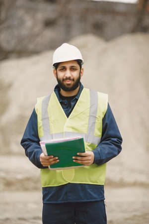 Man engineer with white helmet and safety vest is taking notes on a clipboard while inspecting a construction site at sunrise in early morning, vertical front view. Architecture and engineering