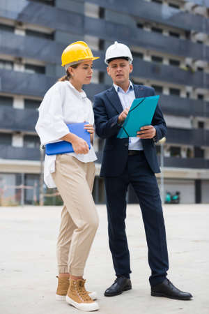 Construction manager and engineer dressed in orange work vests and hard helmets explore construction documentation on the building site near the steel frames