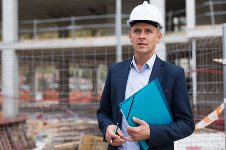 Confident businessman and engineer posing with a safety helmet, he is looking away and thinking