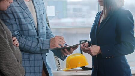 Group engineers discussion and planning about the project to be made on table. Brainstorming of engineers. Construction engineering conceptual. Three architects in office and discussing design project