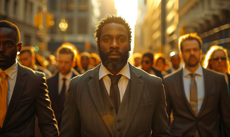 Portrait of African American mature businessman in suit among crowd of business people in urban city