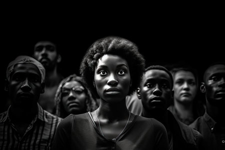group of african american young people standing together and looking at camera