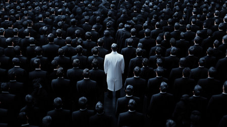 solitary white figure in crowd of dark figures, artistic concept