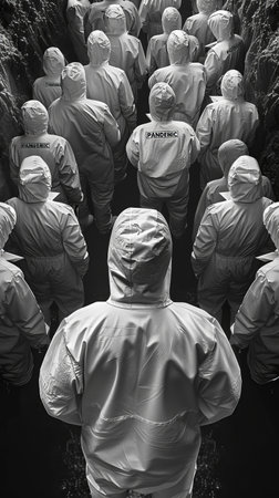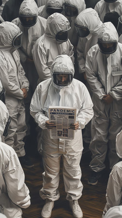 A group of people in white suits are standing together and one of them is holding a newspaper with the headline Pandemic
