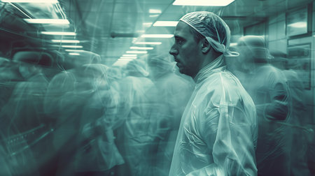 photo of a doctor in an emergency room. Toned image double exposure