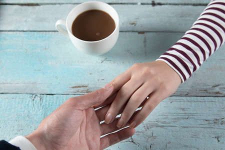 Close-up of the hands of a man and a woman. Male hands stroking the hands of a young woman stroking. Love and support concept