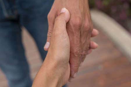 Hands of a man and a woman are connected by a handshake. Metaphor of rescue, love, assistance.