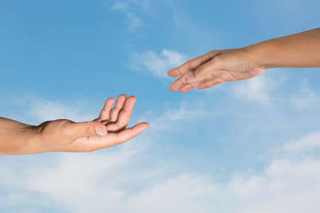 Close-up of two hands reaching out against a cloudy sky background, symbolizing hope, resilience, and the human desire for connection. --chaos