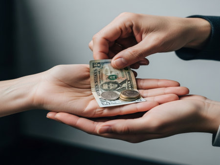 Hand giving dollar money, close-up. Hands holding a dollar bills on white background with copy space. Salary, earning and savings concept