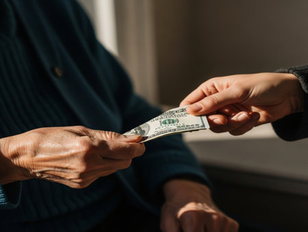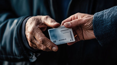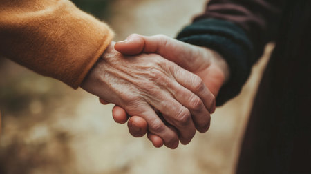 Two elderly individuals share a warm handshake, their hands showing signs of age with wrinkles and tenderness. The scene captures a moment of connection and compassion between them.