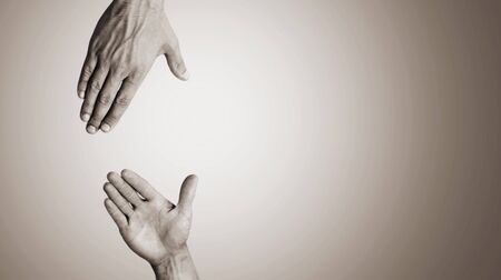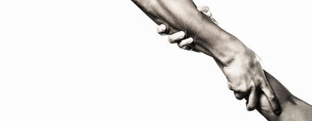 Close up help hand. Helping hand concept, support. Helping hand outstretched, isolated arm, salvation. Two hands, helping arm of a friend, teamwork. Rescue, helping gesture or hands. Copy space