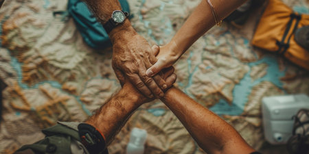 A diverse group of people holding hands over a map, standing united in planning their upcoming trips together.