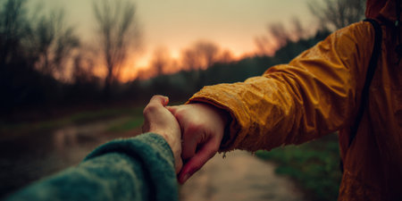 Couple holding hands from a first-person perspective, exploring outdoors during a rainy sunset, symbolizing partnership, love, and support in their relationship journey