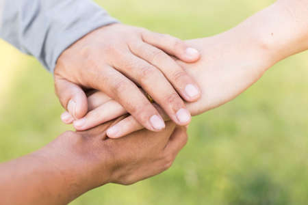 Black and white hands put together on white background . International friendship and business, unity, togetherness , race equality, help concept.