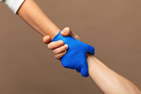 Handshake in a blue gloves, help concept. Personal hygiene during a pandemic