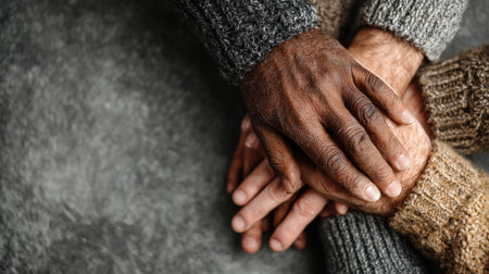 This image showcases a close-up of hands of various skin tones joined together. The hands, wearing textured knitwear sleeves, overlap to create a symbol of solidarity. The composition emphasizes unity against a neutral background. Suitable for illustrating collaboration or teamwork in various commercial applications.