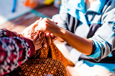 An elderly woman grandmother and a young girl hold hands. Support for the elderly from young people and children. Caring for retired old people.