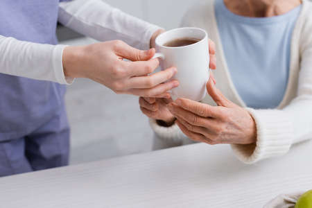 cropped view of social worker giving cup of tea to senior woman, blurred background