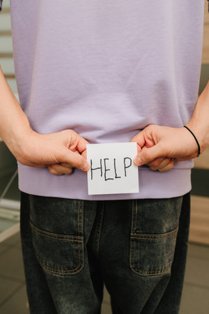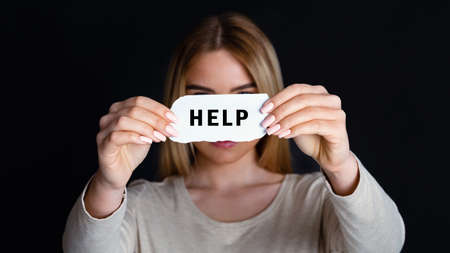 Call for help. Woman unrecognizable holding piece of paper with inscription, panorama, copy space, studio shot