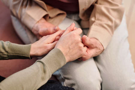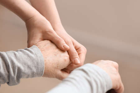 Close up granddaughter takes care of the health sick grandmother at home by holding hands. Lifestyle support the love of the family.