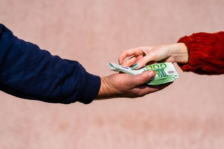 Hand giving money like bribe or tips or salary isolated, hard worked hand taking euro banknotes. Currency transfer and reward for hard work.