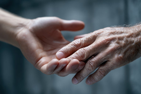 An older hand meets a younger hand in a tender gesture highlighting family bonds and care.