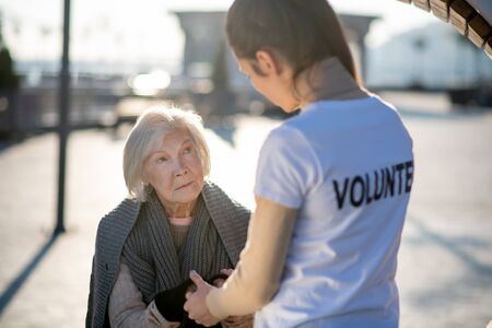 Pensioner and volunteer. Homeless aged hungry pensioner talking to volunteer in the street