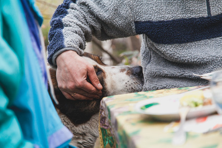 Affectionate master. A hand strokes the Central Asian sheepdog in front of the table in the yard. Dog closed his eyes with pleasure