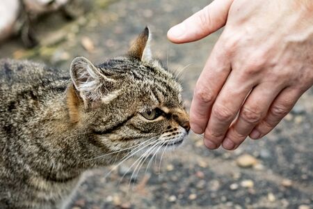 Homeless gray cat and a mans hand close up