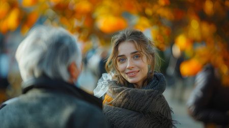Young woman cheerfully helping an elderly neighbor in an autumn park, carrying a net bag of produce. Warm and friendly interaction amid vibrant fall colors.