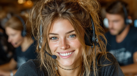 Smiling woman with headset works in a busy office, showcasing friendly customer service.
