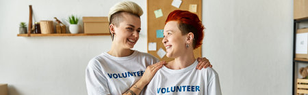 A young lesbian couple, wearing volunteer t-shirts, uniting in charity work.